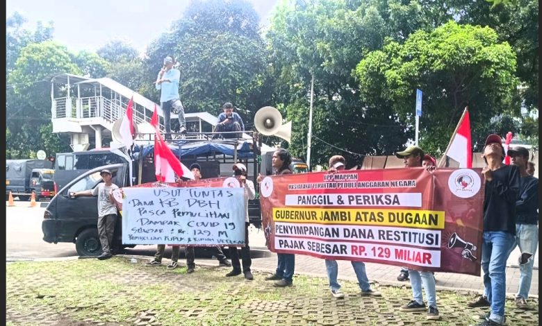 Aksi tersebut dikoordinatori Andri dan Sukri selaku koordinator lapangan. Mereka membawa spanduk dan pernyataan sikap yang menyoroti proses pengajuan dan pencairan dana sekitar Rp129,5 miliar yang diajukan Pemerintah Provinsi Jambi ke Kementerian Keuangan.