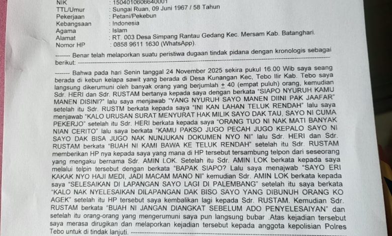 JAMBI – Eri, seorang buruh panen sawit di Desa Kunangan, Tebo Ilir, Kabupaten Tebo jadi korban intimidasi dan perampasan Tandan Buah Segar (TBS) Sawit hasil panen oleh sejumlah massa yang mengaku warga Desa Teluk Rendah Pasar, atas perintah mantan anggota DPRD Provinsi Jambi pada Senin sore 24 November 2025.